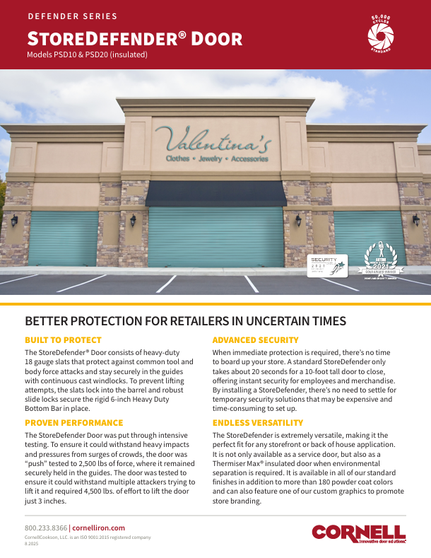 It features an 18 gauge curtain, 6” heavy duty bottom bar, tamper resistant fasteners and continuous wind locks that keep the curtain in place during crowd pressure. It also comes with a screw kit that will allow the top slats to be attached to the barrel to prevent lifting attempts. All of these components make the StoreDefender Door able to withstand a moderate risk attack with 3+ attackers and a few hand tools.