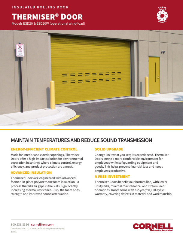 Thermiser Insulated Rolling Doors, designed for exterior use, help maintain different temperatures on each side of the door. These insulated rolling doors are an ideal choice for use in environments that require climate control, security and durability: distribution, industrial, hospitality, retail and more.